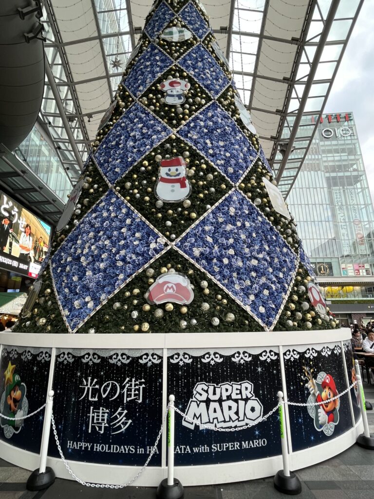 ここにもマリオが、、、 Uncategorized 2025.12.21 クリスマス直前の日曜日。 予想どおり博多駅も賑わっています。博多口のツリーも、日が暮れると綺麗なイルミネーションで楽しませてくれるのだと思います。 よく見るとマリオ、ピーチ姫(だったかな?)がいた! 今、JR九州がスーパーマリオとコラボしてるもんね。 ツリーの一番上の部分が入ってない、、、、座って撮れば良かった、、、
