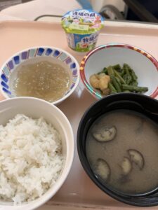 メニュー:米飯(中)150g、味噌汁(ナス・人参)、アスパラとエビのソテー、ところてん、ヨーグルト