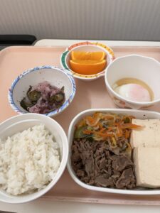 メニュー:米飯(中)150g、すき焼き、温泉卵、胡瓜と白キクラゲの酢物、果物・オレンジ