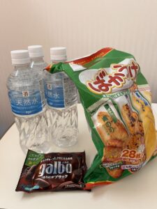 水とお菓子(「ばかうけ」と「galbo」)を購入しました。コーヒーはこぼすリスクがあったので断念しましたが、入院以来ずっと水しか飲んでいなかったので、チョコ菓子の甘さが染み渡りました。こんなに甘さをしっかり感じたのは久しぶりです。