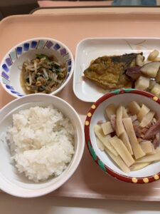 メニュー:米飯(中)150g、魚のカレームニエル、付)さつまいも、たけのことベーコンのソテー、なめたけ和え