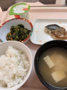 メニュー:米飯(中)150g、味噌汁(椎茸・厚揚)、鯖の塩焼き、春菊の胡麻和え、ヨーグルト