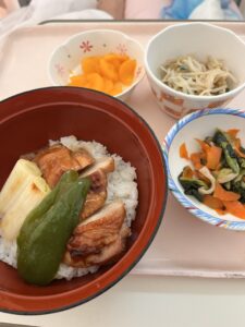 メニュー:米飯(中)150g、鶏の照り焼き丼の具、もやしとカニカマの甘酢、チンゲン菜のソテー、フルーツ缶(ミカン)