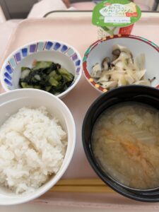 メニュー:米飯(中)150g、味噌汁(白菜・人参)、竹輪の青のり炒め、チンゲン菜と干エビ和え物、ヨーグルト
