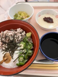メニュー:オクラとろろそば(中)、かけつゆ、キャベツのカレー炒め、豆乳ゼリー小豆かけ