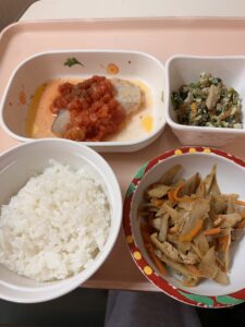 メニュー:米飯(中)150g、魚のムニエルトマトソースかけ、金平ごぼう、白和え