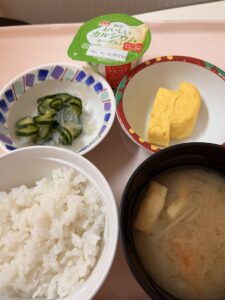 メニュー:米飯(中)150g、味噌汁(モヤシ・人参)、だし巻き卵、胡瓜と寒天の浅漬け、ヨーグルト