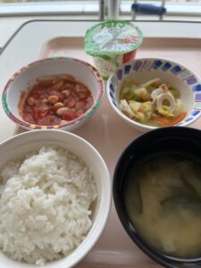 メニュー:米飯(中)150g、みそ汁(ワカメ・エノキ)、大豆とトマトの煮込み、白菜のわさび和え、ヨーグルト