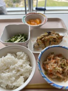 メニュー:米飯(中)150g、鮭のちゃんちゃん焼き、切り干し大根の煮物、オクラの梅肉和え、フルーツ缶(ミカン)
