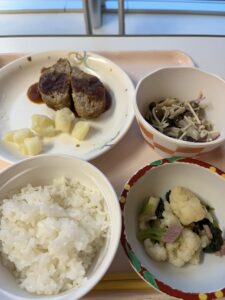 メニュー:米飯(中)150g、ミートローフ、付)粉吹き芋、カリフラワーのソテー、きのこのマリネ