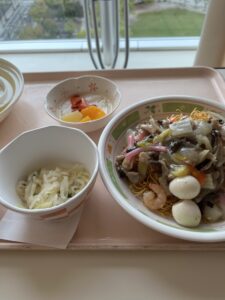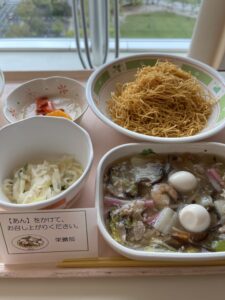 メニュー:皿うどん(麺)、皿うどん(あん)、ピリ辛なます、杏仁フルーツ