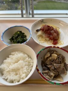 メニュー:米飯(中)150g、白身魚のトマト煮、付)スパゲッティソテー、筍と牛肉の炒めもの、ピーナッツ和え