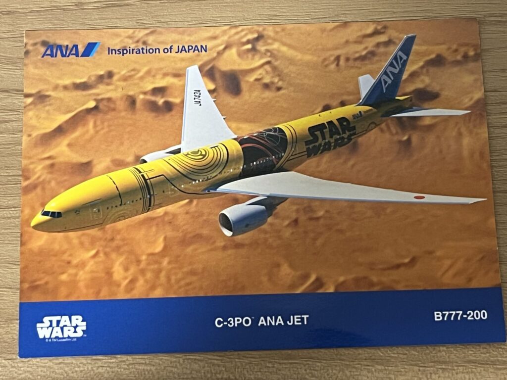 さらに搭乗した機材はSTAR WARSの特別塗装機「C-3PO ANA JET」でした。機体の写真は撮り忘れましたが、機内でポストカードをいただいたので、その写真です。